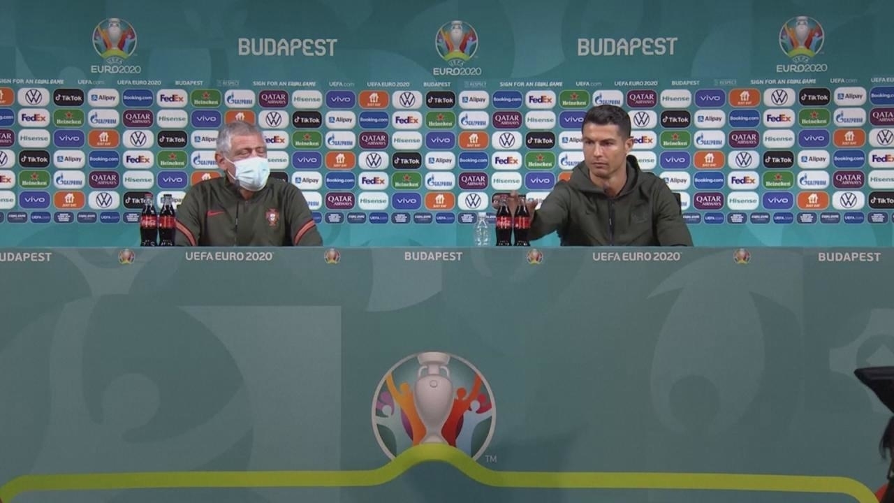 El delantero de la Juventus y de Portugal miró hacia un lado antes de alejar las botellas y decir «beba agua» mientras su micrófono aún estaba apagado antes de decir con desaprobación: «Coca-Cola».