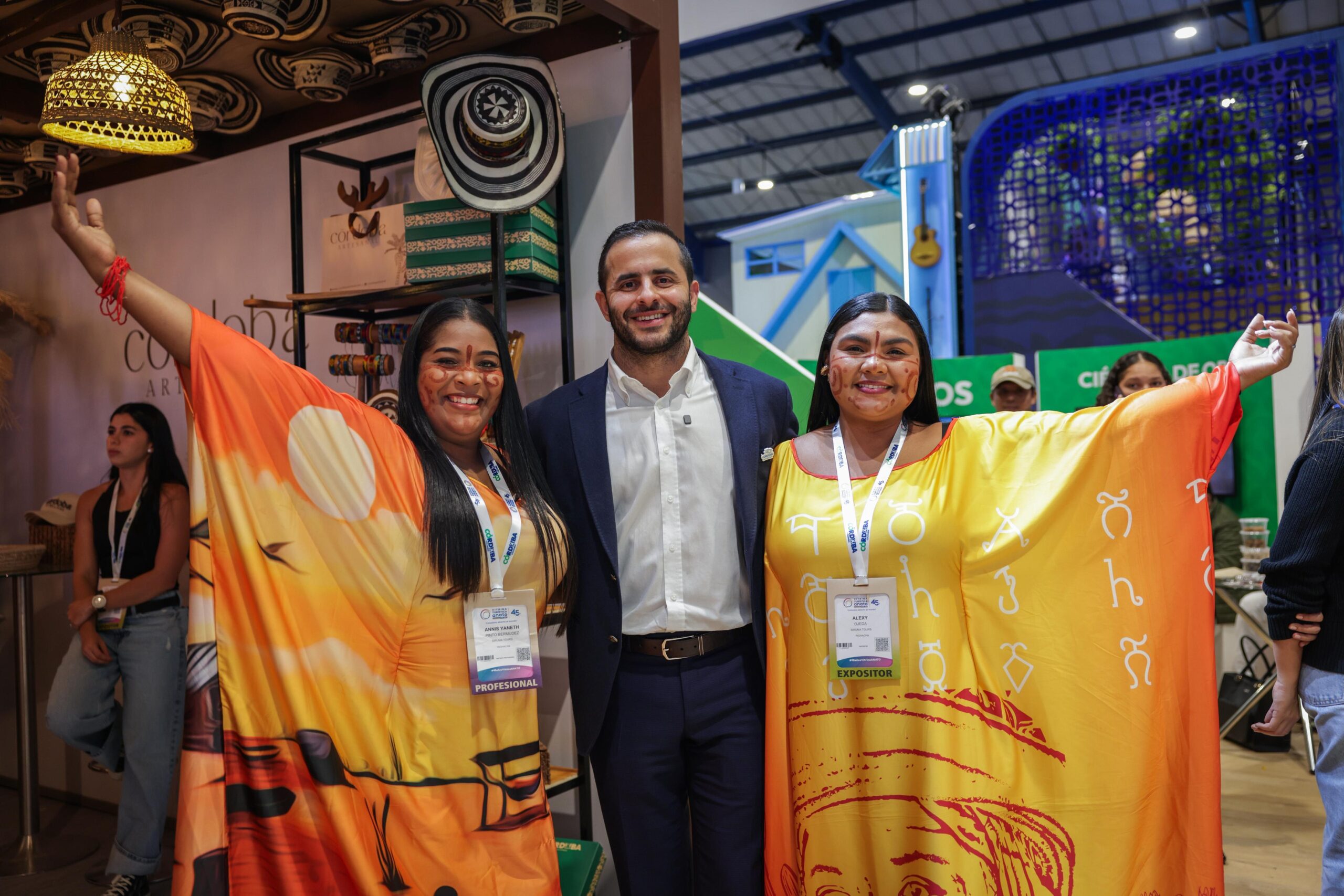 El stand fue concebido como una experiencia viva del territorio. Sus estaciones representan la identidad cultural a través de artesanías elaboradas por comunidades indígenas zenú y emberá, exaltando el talento ancestral y el valor de lo hecho a mano.