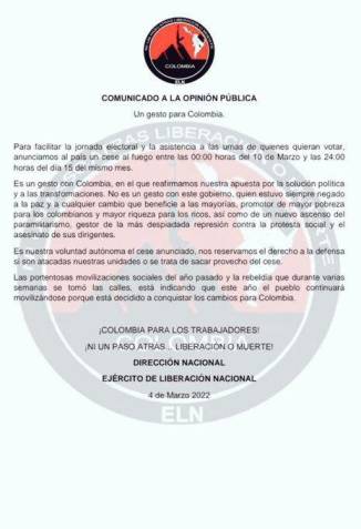 A través de un comunicado, el Ejercito de Liberación Nacional anunció que desde el 10 hasta el 15 del mismo mes, realizarán un cese al fuego en el entorno de la época electoral.