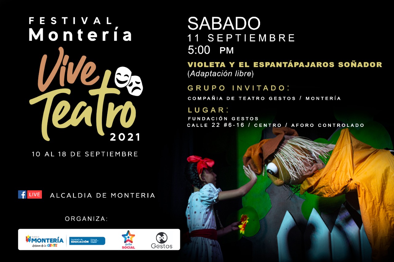 A las 5:00 pm de este mismo sábado, el festival presentará su primera obra teatral, “Violeta y el Espantapájaros Soñador”, la cual estará a cargo, de la compañía de Teatro Gestos de Montería. Usted puede verla a través del Facebook Live de la Alcaldía de Montería.