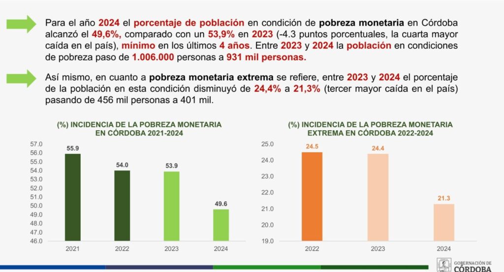 De acuerdo con el documento, Córdoba alcanzó una disminución en la pobreza monetaria hasta el 49,6%, la cuarta mayor caída en el país y el porcentaje más bajo en los últimos cuatro años. Entre 2023 y 2024, la población en esta condición pasó de 1.006.000 a 931.000 personas, lo que representa una reducción de 4,3 puntos porcentuales.