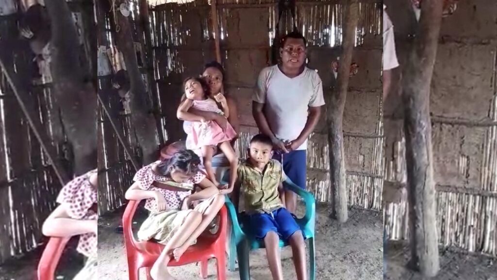 Acto seguido, el padre de familia muestra las condiciones de su rancho de palma y un baño improvisado tapado en palma de coco donde deben cumplir con sus necesidades fisiológicas.