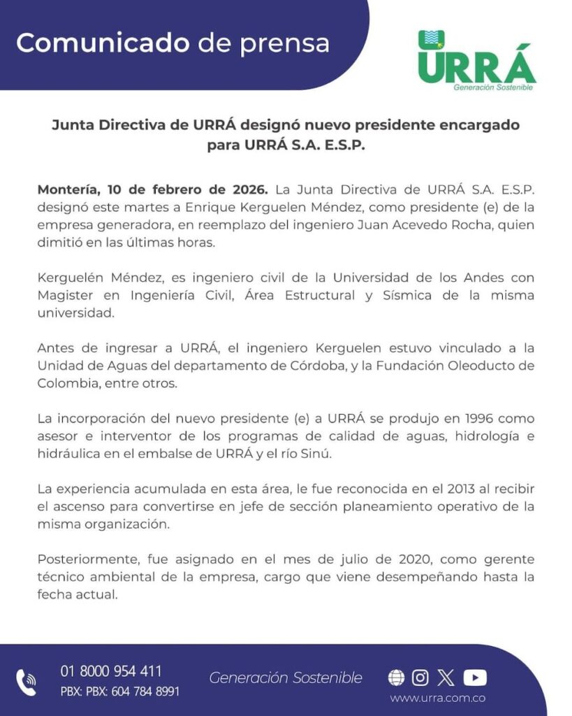 La Junta Directiva de URRÁ S.A. E.S.P. designó a Enrique Kerguelén Méndez como nuevo presidente encargado de la empresa generadora, tras la renuncia presentada por el ingeniero Juan Acevedo Rocha en las últimas horas.