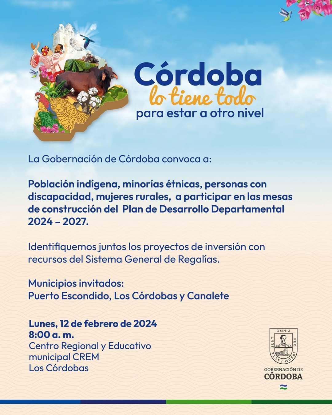 El encuentro se realizará en el Centro Regional y Educativo municipal CREM de Los Córdobas, a partir de las 8:00 a.m. Allí fueron convocados los alcaldes y comunidades de los municipios de Puerto Escondido, Canalete y Los Córdobas.