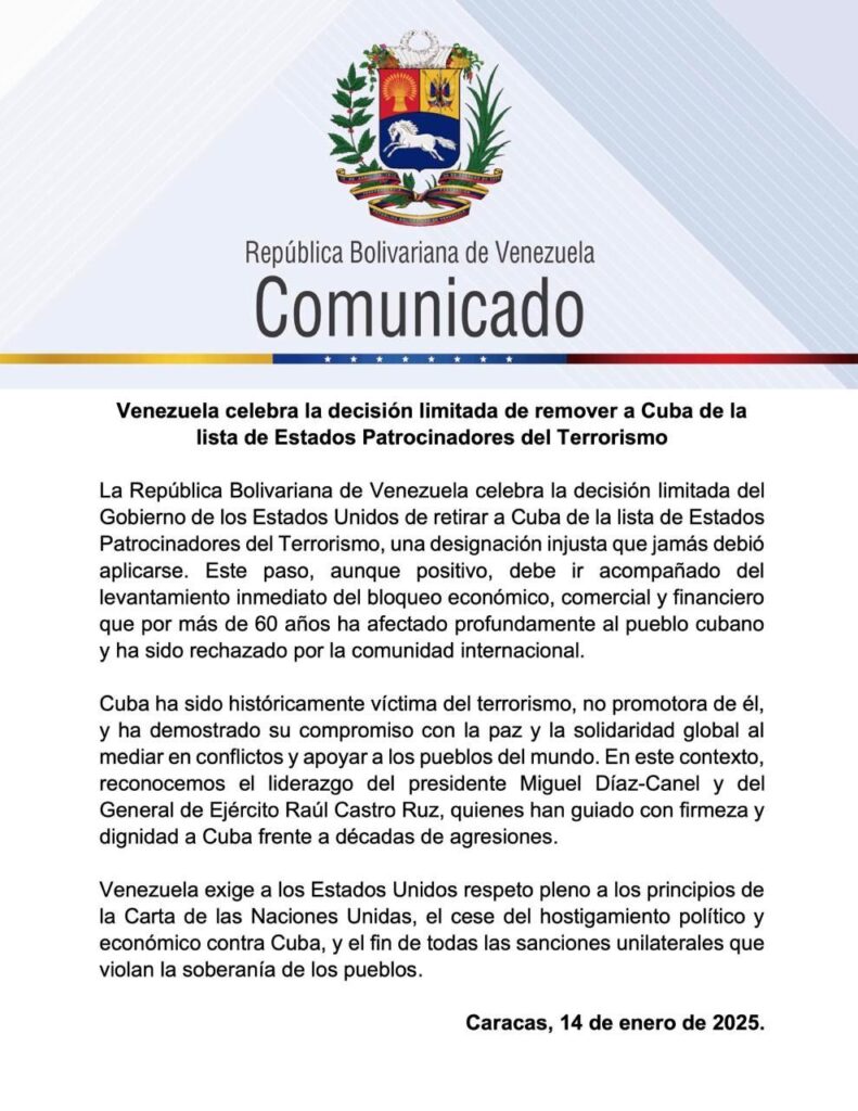 En un comunicado difundido mediante Telegram por el canciller venezolano, Yván Gil, el país caribeño destacó la decisión de Washington, y consideró que la “injusta” designación contra la isla “jamás debió aplicarse”.