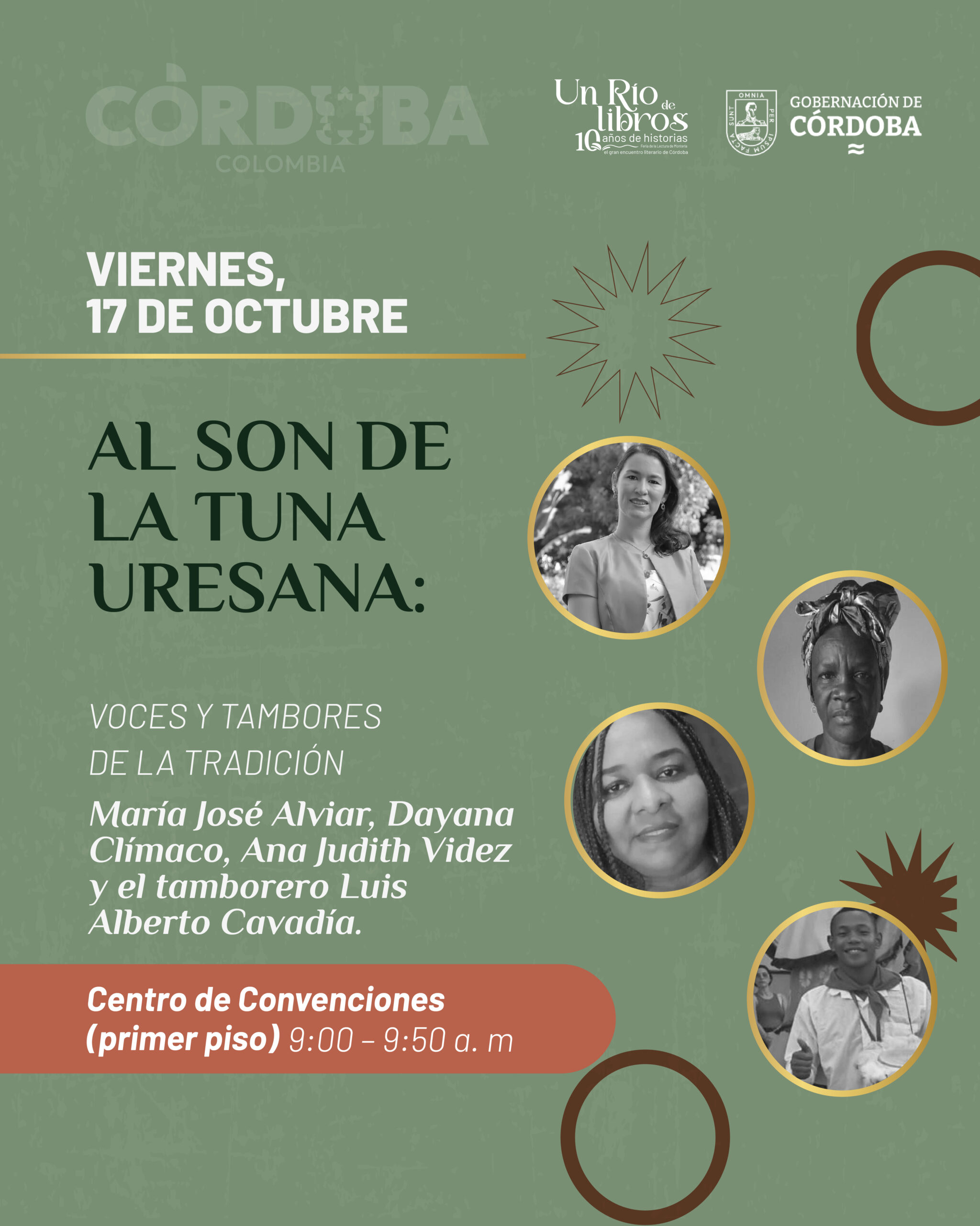 A las 9:00 a. m., el sonido del tambor y la tradición afrocordobesa llegarán con “Al son de la tuna uresana: voces y tambores de la tradición”, donde María José Alviar, Dayana Clímaco, Ana Judith Videz y el tamborero Luis Alberto Cavadía mostrarán cómo la música y la danza de San José de Uré mantienen viva la herencia cultural de sus ancestros.