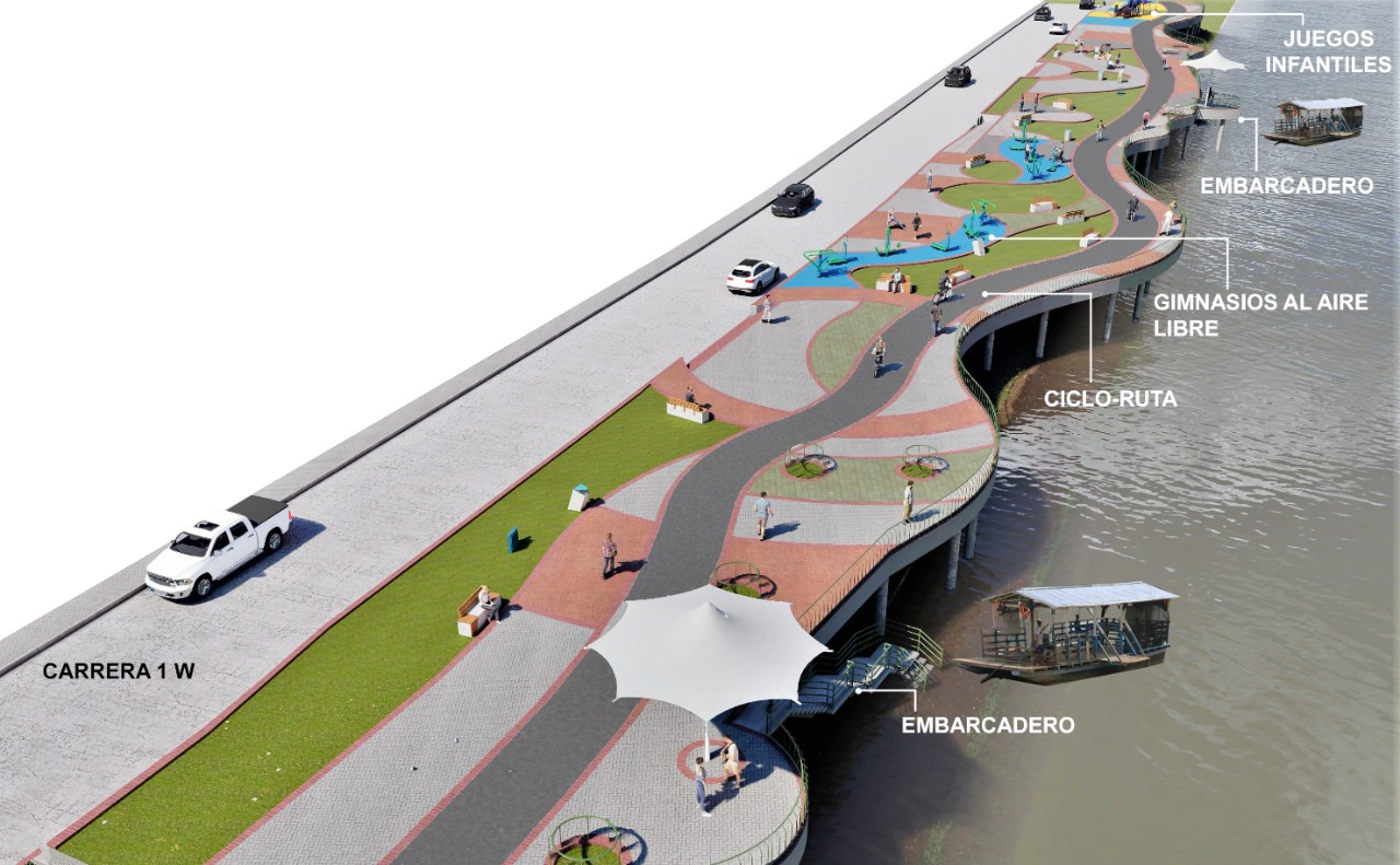 El proyecto contempla: senderos y plazoletas con mobiliario urbano como bancas, bolardos, cicloparquedaeros, puntos ecológicos de residuos, ciclorruta, miradores, 2 embarcaderos, área de gimnasios al aire libre, área de juegos para niños e incluyentes, rampas para personas con movilidad reducida.