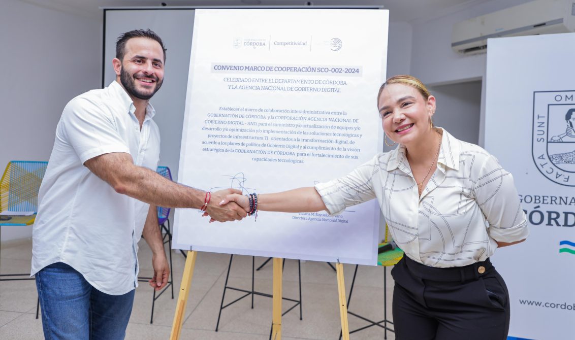 En el evento, el Gobernador Erasmo Zuleta Bechara y Viviana Bayuelo Serrano, directora de la Agencia Nacional Digital, firmaron un convenio de colaboración interadministrativa entre la Gobernación de Córdoba y la entidad, lo que ratifica el compromiso de la administración departamental de fortalecer las capacidades tecnológicas del ente territorial.