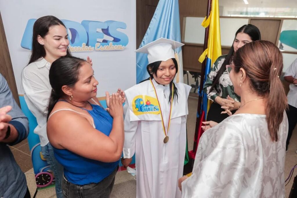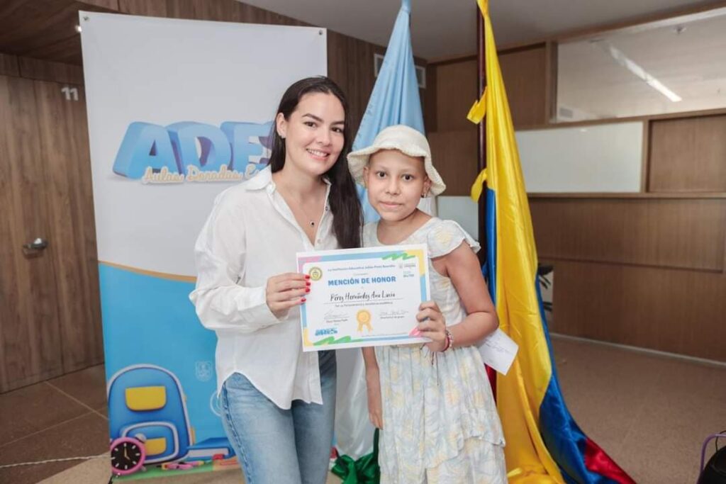 “Cumplimos un sueño: hoy graduamos y promovemos a la primera cohorte de estudiantes que forman parte de las Aulas Doradas Escolares”, expresó Valeria Vega, gestora social del departamento de Córdoba, durante la ceremonia en la que, con honores, 12 niños que reciben tratamientos médicos en la Clínica IMAT pudieron continuar su año escolar gracias a la creación de ADES.