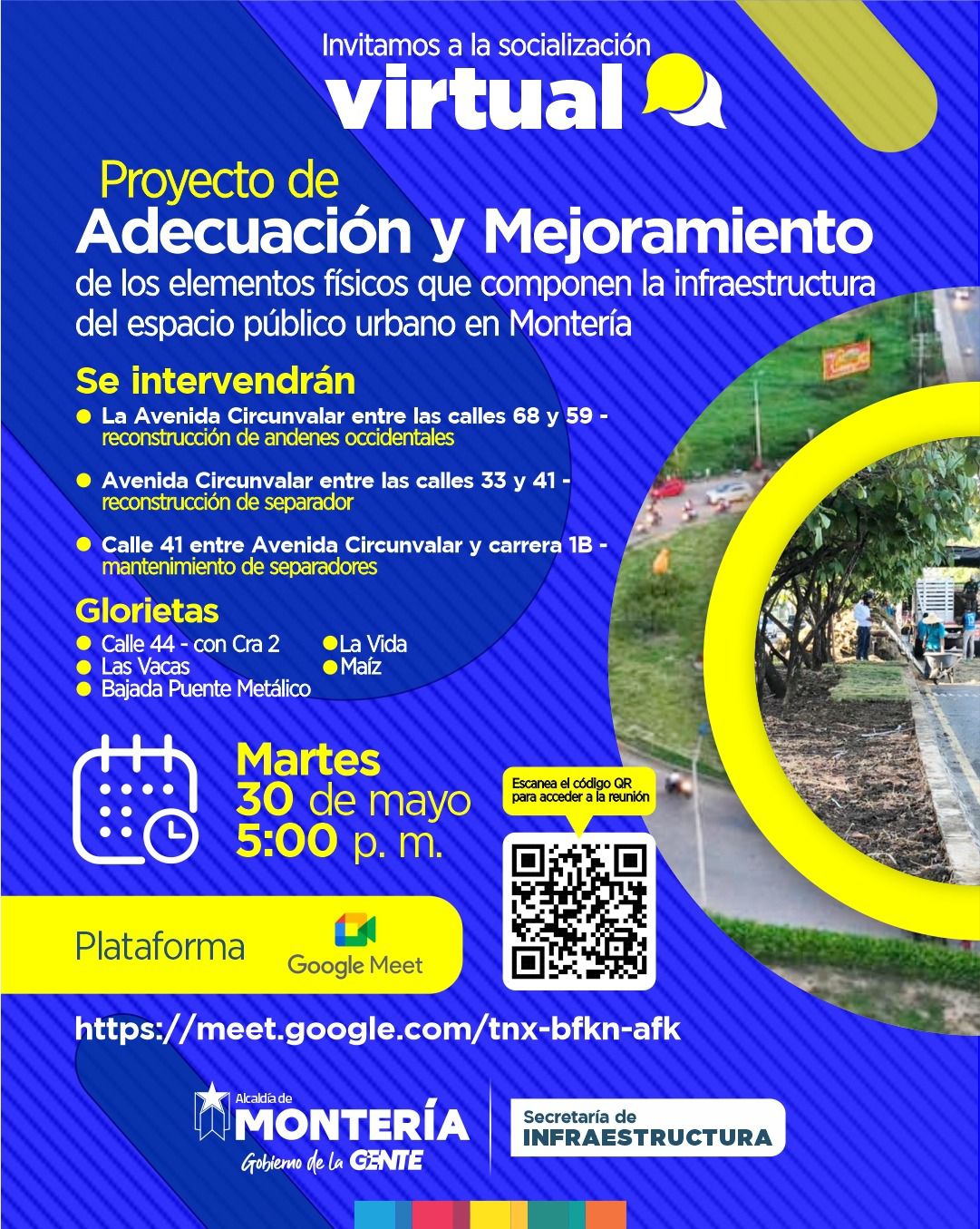 Con el propósito de informar a la ciudadanía a detalle sobre las intervenciones que se ejecutarán en cada uno de los puntos mencionados, se realizará una reunión virtual este martes 30 de mayo a las 5:00 p.m a la cual se invita a todas las personas interesadas a participar, conectarse mediante el link meet.google.com/tnx-bfkn-afk.