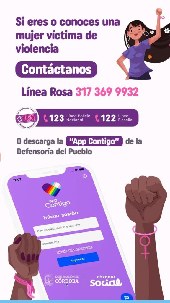 A través de estos medios telefónicos las mujeres pueden solicitar orientación y reportar posibles casos de violencia: Línea Rosa 317 369 9932, Patrulla Púrpura Montería 3183587555, Línea 155, Línea 123 Policía Nacional, Línea 122 Fiscalía, «App Contigo» de la Defensoría del Pueblo.