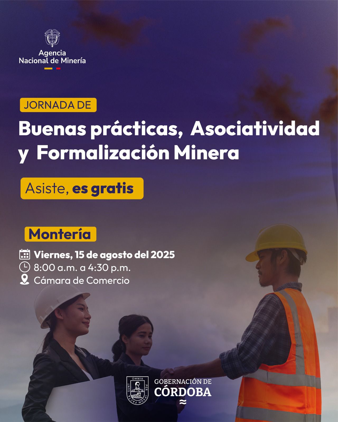 Montería, 14 de agosto de 2025. La Gobernación de Córdoba, en articulación con la Agencia Nacional de Minería, invita a todos los actores del sector minero del departamento a participar en la Jornada de Buenas Prácticas, Asociatividad y Formalización Minera, un espacio abierto diseñado para fortalecer los procesos que fortalezcan la minería responsable y sostenible en la región.