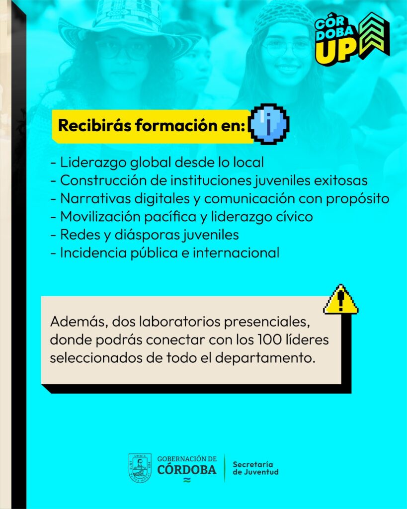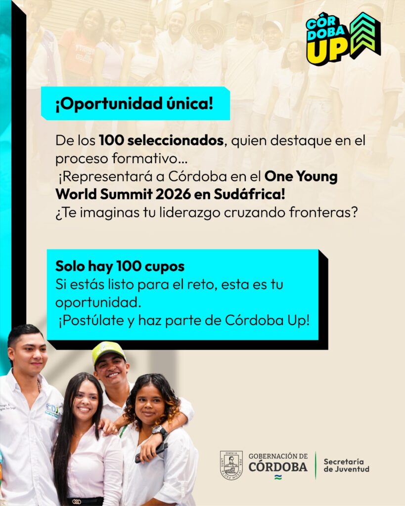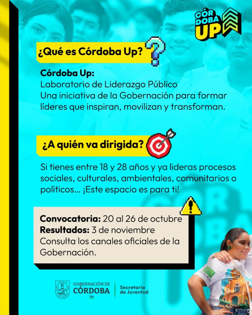 Con esta iniciativa, la Gobernación de Córdoba reafirma su apuesta por fortalecer el liderazgo juvenil como motor de transformación social y desarrollo territorial. Córdoba Up es una oportunidad para que las nuevas generaciones se preparen, participen y hagan parte activa de los cambios que necesita el departamento.