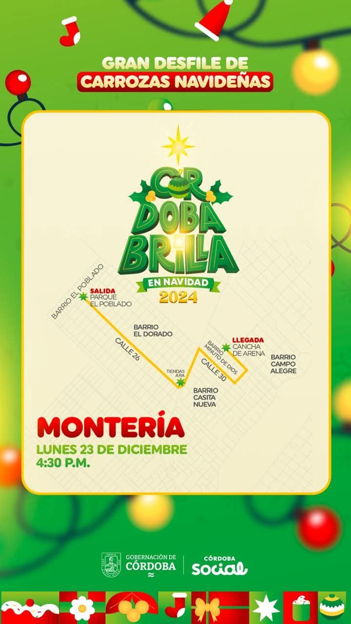 La Gobernación de Córdoba informa que hoy, lunes, en el octavo día de la novena al Niño Jesús, las actividades navideñas que usualmente se realizan en el parque principal se trasladarán a la cancha de arena del barrio Minuto de Dios. Esto incluirá el esperado show “Córdoba brilla en Navidad” y las sorpresas para los niños, después de un desfile que recorrerá las calles de la margen izquierda de Montería.