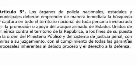“Los órganos de policía nacionales, estadales y municipales deberán emprender de manera inmediata la búsqueda y captura en todo el territorio nacional de toda persona involucrada en la promoción o apoyo del ataque armado de Estados Unidos de América contra el territorio de la República (…) con miras a su juzgamiento”, señala el decreto.