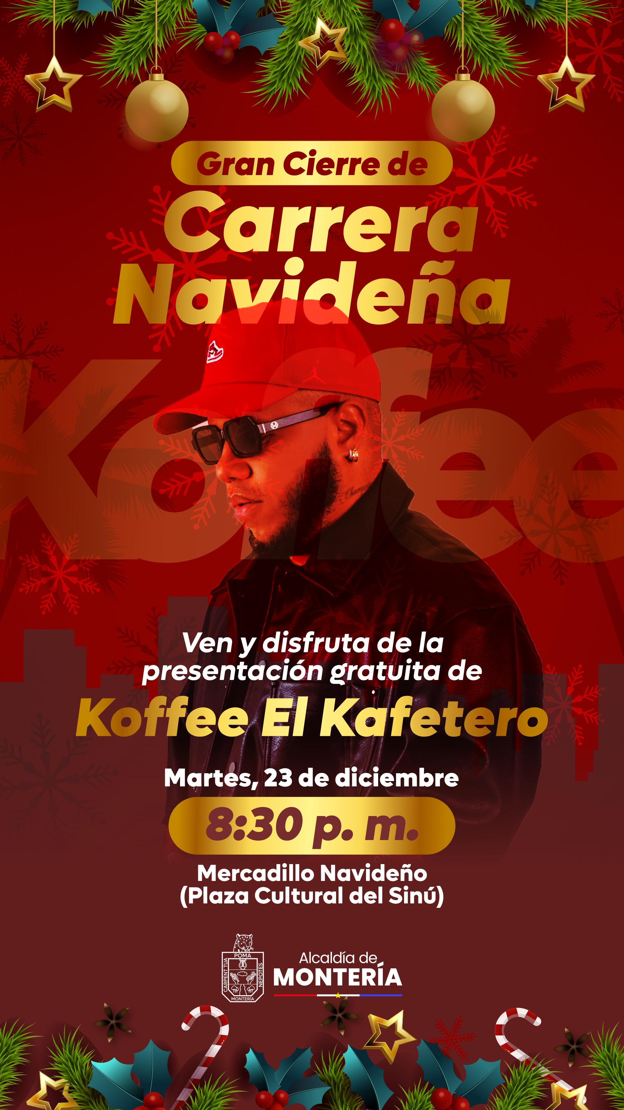 Como broche de oro de esta jornada, los monterianos y visitantes podrán disfrutar de la presentación gratuita de Koffee El Kafetero, uno de los exponentes más reconocidos de la música urbana del país, quien se presentará este martes 23 de diciembre, a partir de las 8:30 p. m., en el Mercadillo Navideño, ubicado en la Plaza Cultural del Sinú.