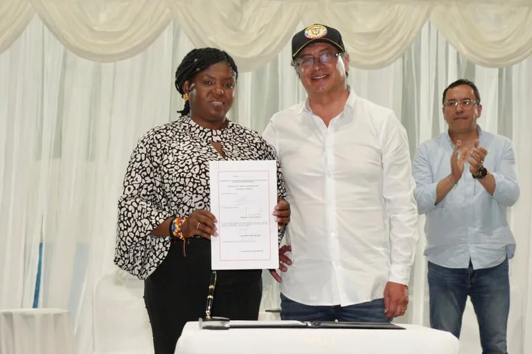 Luego de una angustiante espera de seis horas, que alcanzó a reflejarse en el rostro de la vicepresidenta de Colombia, Francia Márquez Mina, el presidente de Colombia hizo su arribo a eso de las siete de la noche. Tras su llegada, tuvo lugar la firma del documento que legalizó la creación de este ministerio, que fue una promesa de campaña y cuya dirección estará a cargo de Márquez.