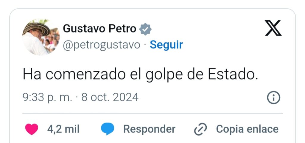 Luego de que la sala plena del Consejo Nacional Electoral decidiera formular cargos en contra de la campaña presidencial de Gustavo Petro, el mandatario de los colombianos aseguró en sus redes sociales que había iniciado el “golpe de Estado”.