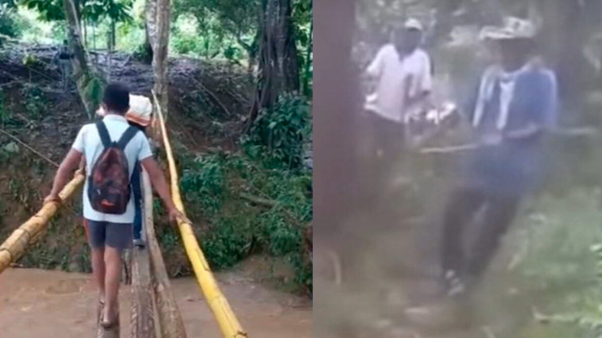 Con cuerdas y palos cortados por ellos mismos, los habitantes de la vereda La Oscurana, del municipio de Tierralta, tuvieron que improvisar un puente artesanal para evitar quedar incomunicados con el casco urbano de esa localidad.