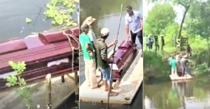La particular embarcación permitió que el cadáver fuera trasladado desde una margen a la otra, sobre una afluente. Luego de diez minutos de travesía, el féretro llegó al otro lado, donde otros dolientes lo esperaban, para culminar su llegada al campo santo.