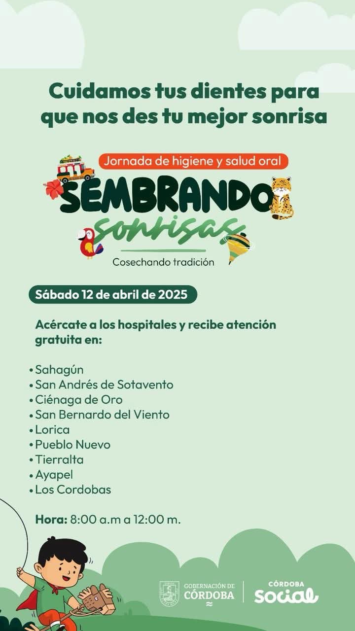 Las jornadas que incluyen limpieza dental, aplicación de flúor y valoración odontológica, se llevarán a cabo en Sahagún, San Andrés de Sotavento, Ciénaga de Oro, San Bernardo del Viento, Lorica, Pueblo Nuevo, Los Córdobas, Tierralta y Ayapel, en el horario de 8:00 de la mañana a 12:00 del mediodía día, completamente gratuita. Consulta las redes sociales de las ESE e infórmate.