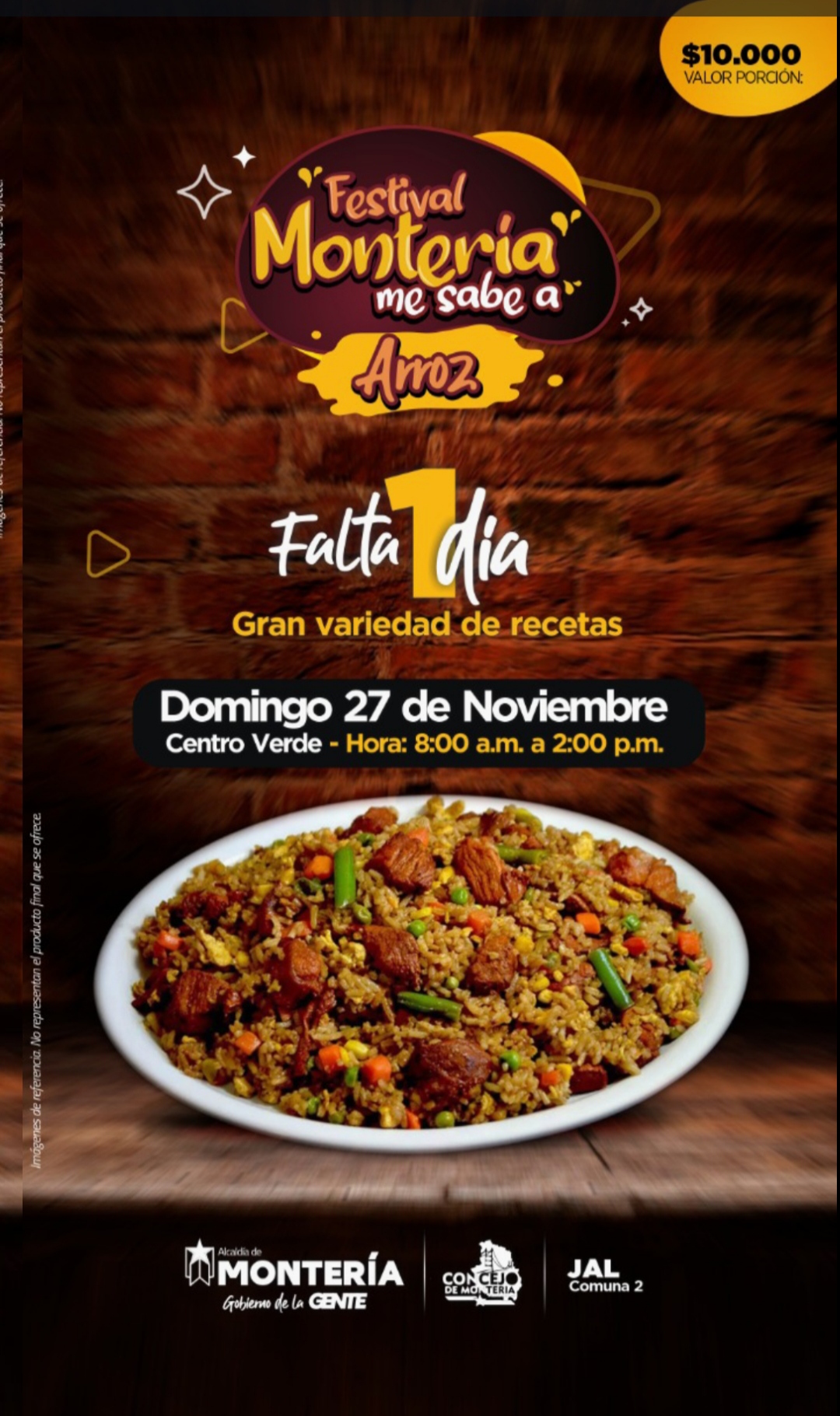 Montería, 26 de noviembre de 2022- Todo está listo para el Primer Festival Montería Me Sabe a Arroz, que será este domingo 27 de noviembre y que congregará toda una diversidad de recetas para conquistar el paladar de los monterianos.