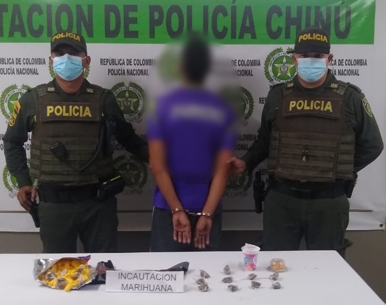 El particular hallazgo se registró mediante labores de control e identificación de personas en el municipio de Chinú, cuando fue capturado un hombre de 21 años, por el delito de Tráfico, fabricación o porte de estupefacientes.