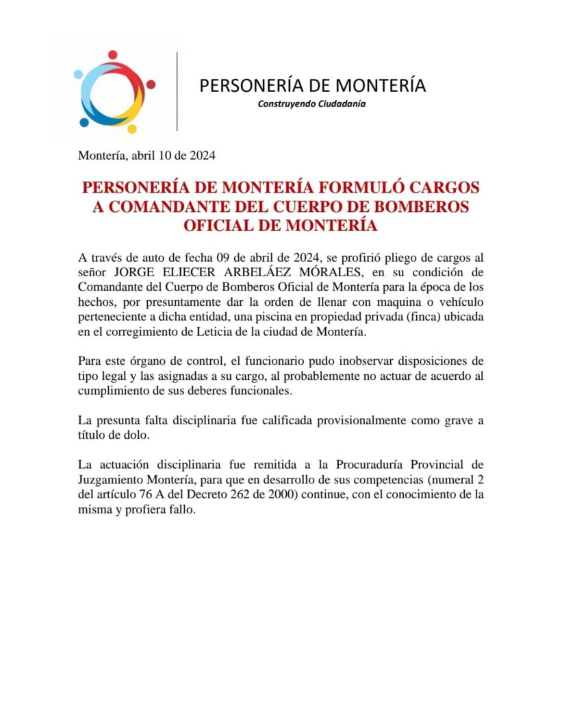 A través de auto de fecha 9 de abril de 2024, se profirió pliego de cargos a Jorge Eliecer Arbeláez Mórales, en su condición de Comandante del Cuerpo de Bomberos Oficial de Montería para la época de los hechos, por presuntamente dar la orden de llenar con maquina o vehículo perteneciente a dicha entidad, una piscina en propiedad privada (finca) ubicada en el corregimiento de Leticia de la ciudad de Montería.