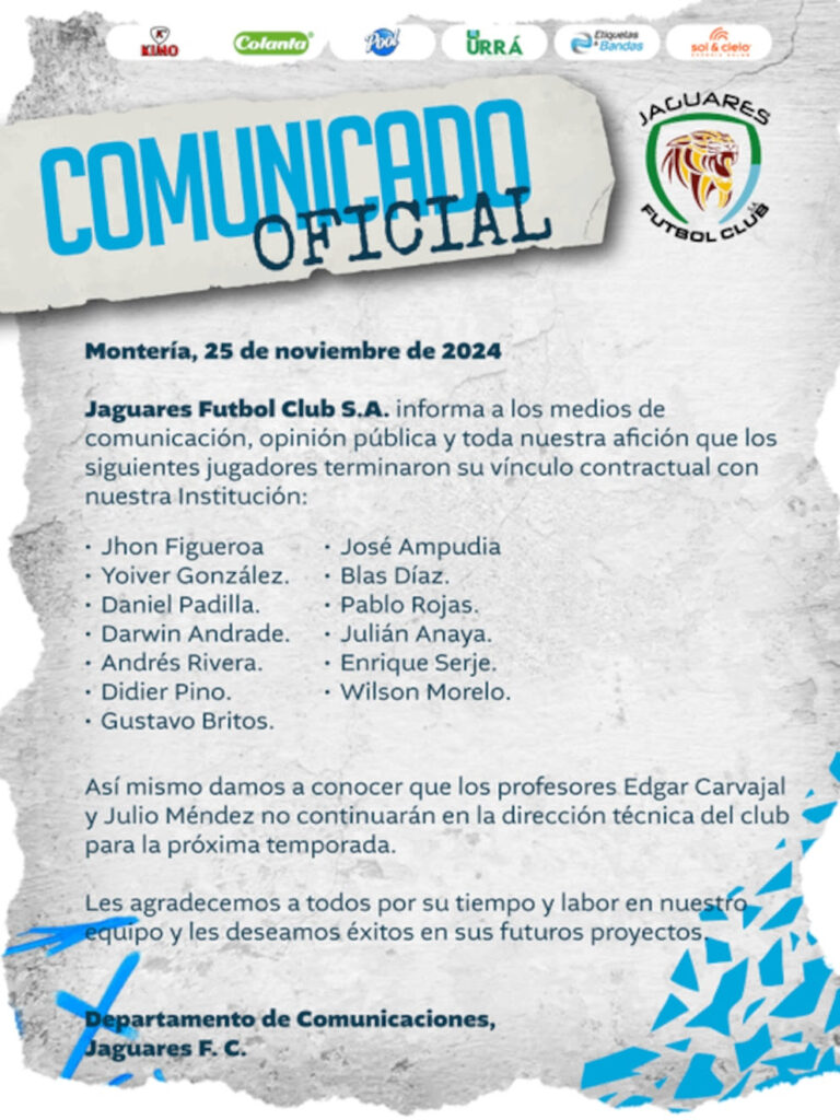 Jaguares Fútbol Club S.A. de Montería a través de un comunicado informó sobre una importante reestructuración en su plantilla para la próxima temporada. Un total de 13 jugadores dejarán el club, entre los que se encuentran nombres destacados como Jhon Figueroa, Daniel Padilla y Gustavo Britos.