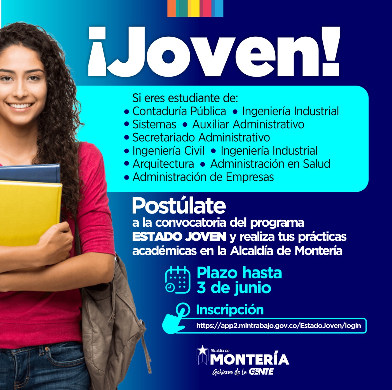Montería, 23 de mayo de 2022- Un total de 10 plazas académicas para que jóvenes monterianos hagan sus prácticas en la Alcaldía de Montería están disponibles, en el marco del programa Estado Joven.