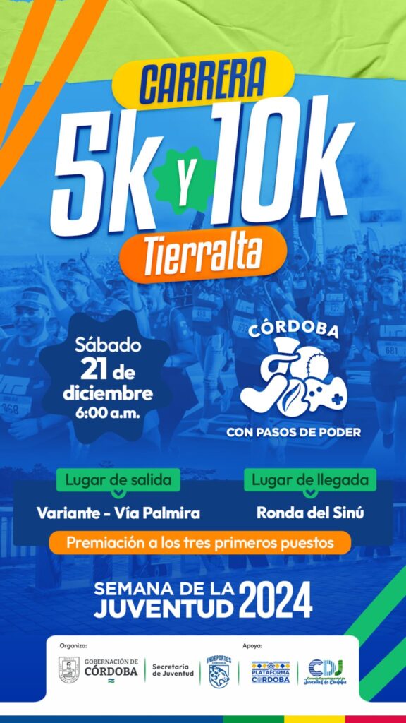 Este sábado, 21 de diciembre, el municipio de Tierralta será el escenario de la carrera atlética “Con pasos de poder”, un evento organizado como parte de la Semana de la Juventud 2024 por la Gobernación de Córdoba. La actividad busca promover el deporte y la unión entre los jóvenes del departamento.