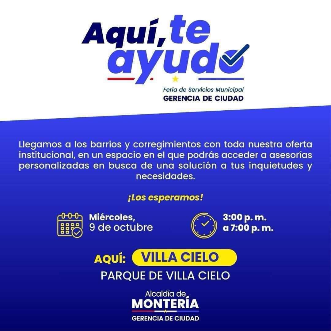 Este miércoles, 9 de octubre, la feria ‘Aquí, te Ayudo’ llegará al barrio Villa Cielo. La Junta de Acción Comunal del sector extiende una invitación a toda la comunidad, así como a los sectore vecinos, para que participen en este evento, que ofrecerá una plataforma donde diversas entidades presentarán su oferta institucional, brindando oportunidades y servicios a los asistentes.
