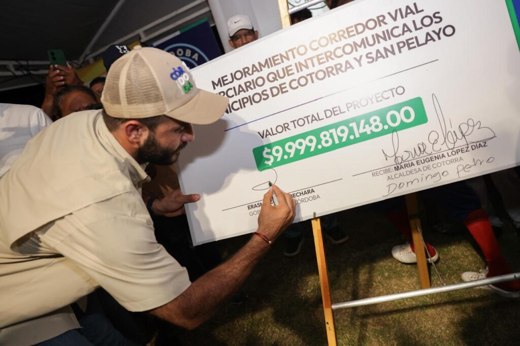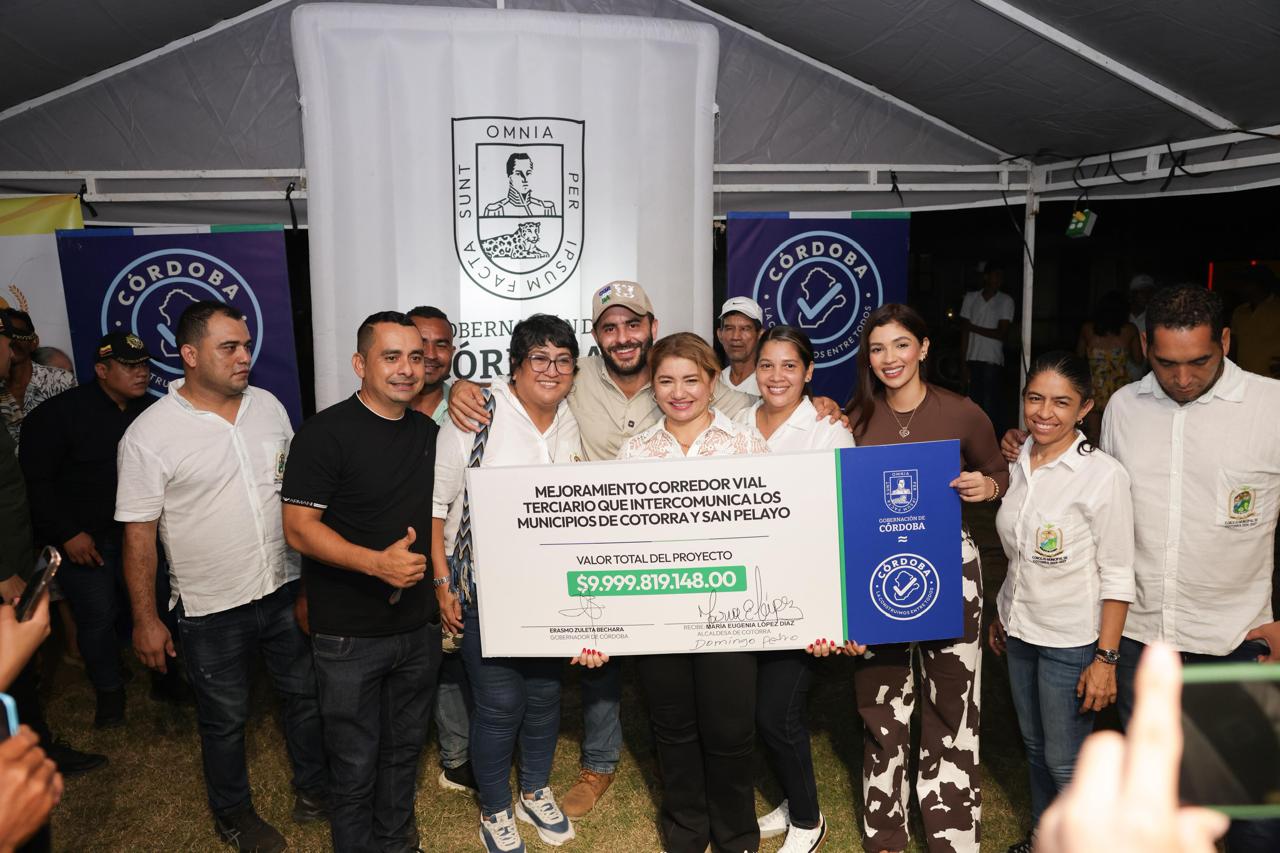 Cotorra, 14 de agosto de 2025. El gobernador de Córdoba, Erasmo Zuleta Bechara, entregó a la alcaldesa María Eugenia López y a la comunidad del corregimiento La Culebra, municipio de Cotorra, un cheque simbólico que representa los recursos para la pavimentación de 2,8 kilómetros que conectarán esta comunidad agrícola con el casco urbano y los municipios de San Pelayo y Chimá, mejorando la movilidad, el comercio y la calidad de vida de miles de familias.