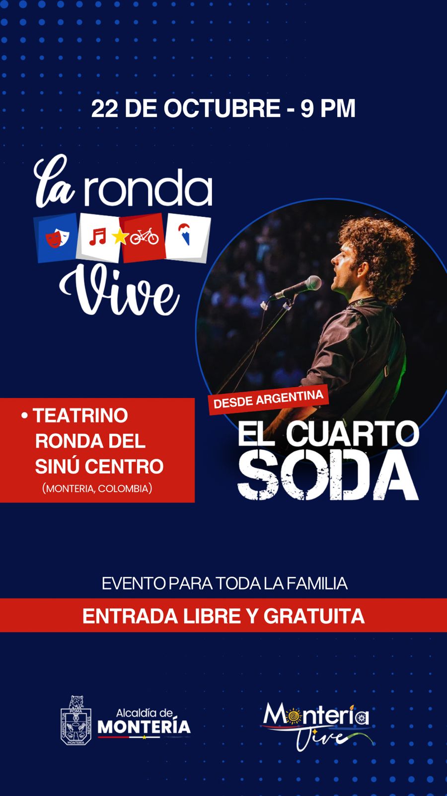 Montería, 20 de octubre de 2025. La Alcaldía de Montería, a través de su programa “La Ronda Vive”, invita a todos los ciudadanos a disfrutar de una noche cargada de nostalgia, energía y rock latino con la presentación especial de El Cuarto Soda, la banda tributo más reconocida de Latinoamérica a la legendaria agrupación argentina Soda Stereo.