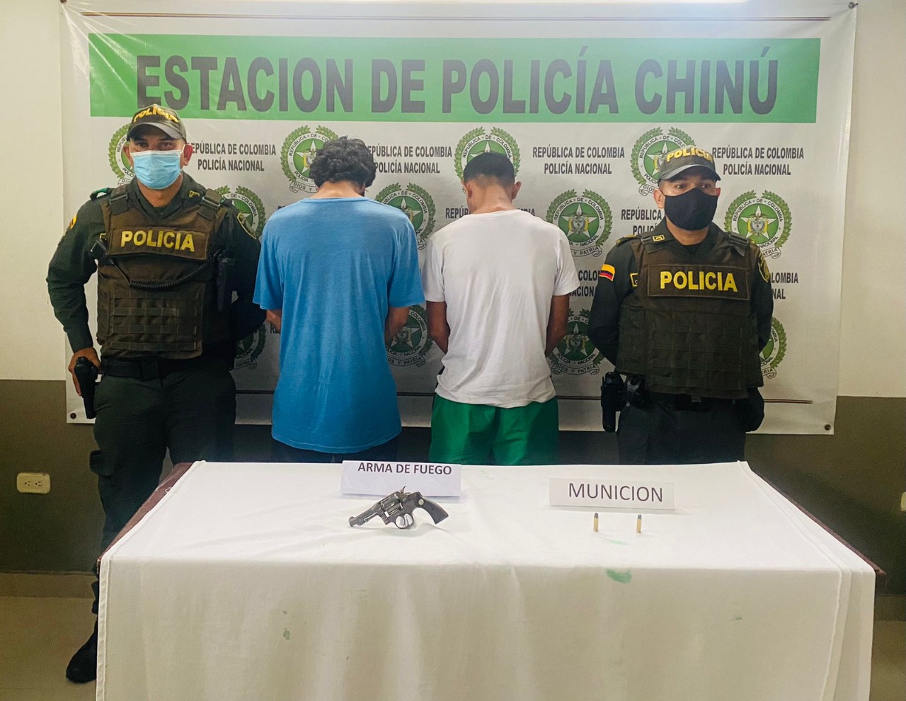 La acción policial se llevó a cabo en el barrio camilo torres, zona céntrica del municipio de Chinú, allí, los uniformados sorprendieron a los sujetos portando de manera ilegal un arma de fuego tipo revolver calibre 32 milímetros con munición.