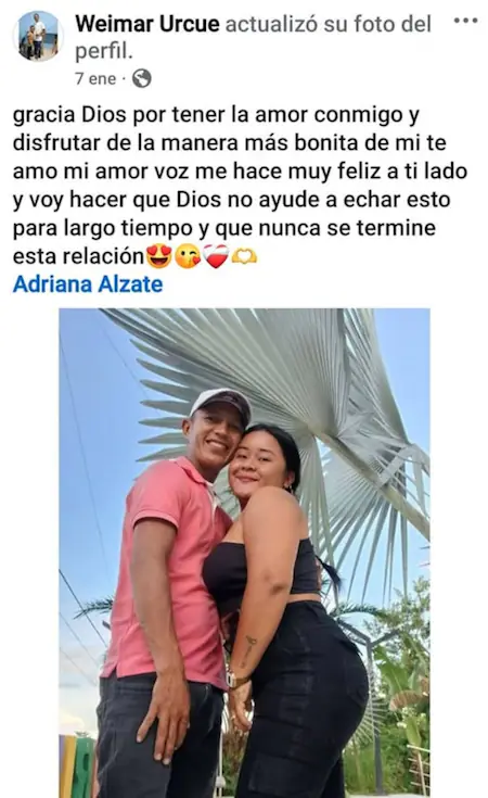 “Gracias Dios por tenerla conmigo y disfrutar de la manera más bonita de mí. Te amo mi amor, voz me haces feliz. Voy a hacer que Dios nos ayude para echar esto para largo tiempo”. Ese es solo uno de los mensajes que a diario dejaba en Facebook la pareja sentimental de Adriana Tejada Alzate, de 26 años.