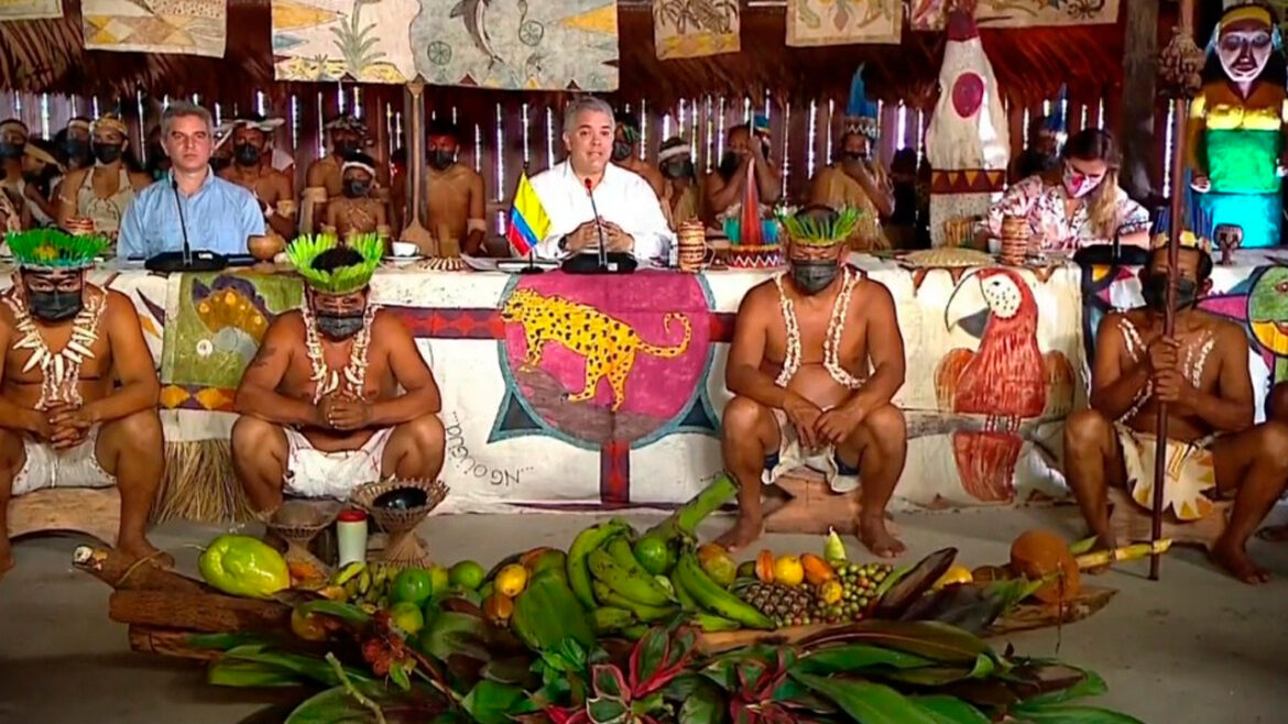 Fuertes críticas en redes sociales ha recibido el Gobierno Nacional por una foto del Presidente de Colombia, Iván Duque Márquez, en la que aparece acompañado en la mesa principal con miembros de su gabinete mientras que un grupo de cuatro indígenas aparecen sentados en butacos a un nivel inferior al del mandatario y sus demás funcionarios.