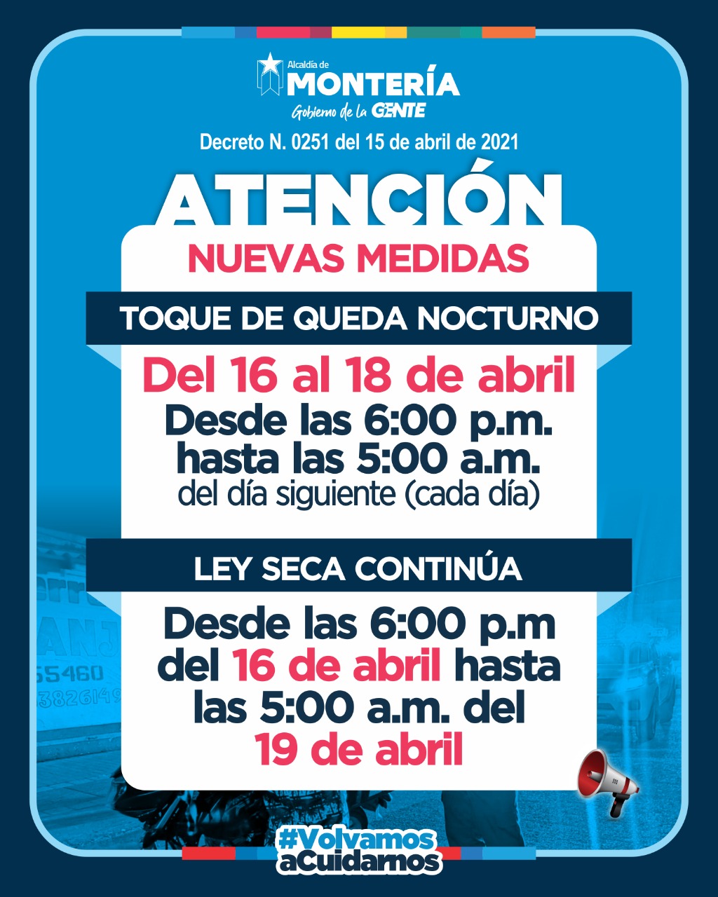 Montería, abril 15 de 2021- El alcalde Carlos Ordosgoitia Sanin confirmó que este fin de semana habrá medidas restrictivas en la ciudad, orientadas en contener y mitigar la pandemia por coronavirus en el municipio. Se trata de ley seca continúa y toque de queda nocturno, las cuales ya fueron avaladas por el Ministerio de Interior.