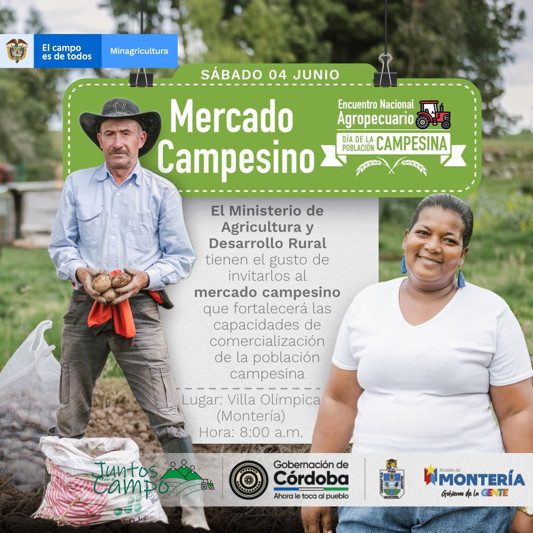 EL Ministerio de Agricultura y Desarrollo Rural, La Gobernación de Córdoba y la Alcaldía de Montería invitan a todos los cordobeses al mercado campesino que se realizará el próximo sábado 4 de junio, en la Villa Olímpica en la ciudad de Montería desde las 8:00 a.m.