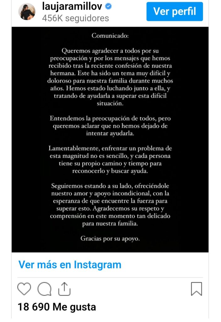 Agregó que el problema de consumo de drogas que presenta su hermana no ha sido fácil de tratar: «Cada persona tiene su propio camino y tiempo para reconocerlo y buscar ayuda». Sin embargo, seguirán en la lucha por sacarla adelante.