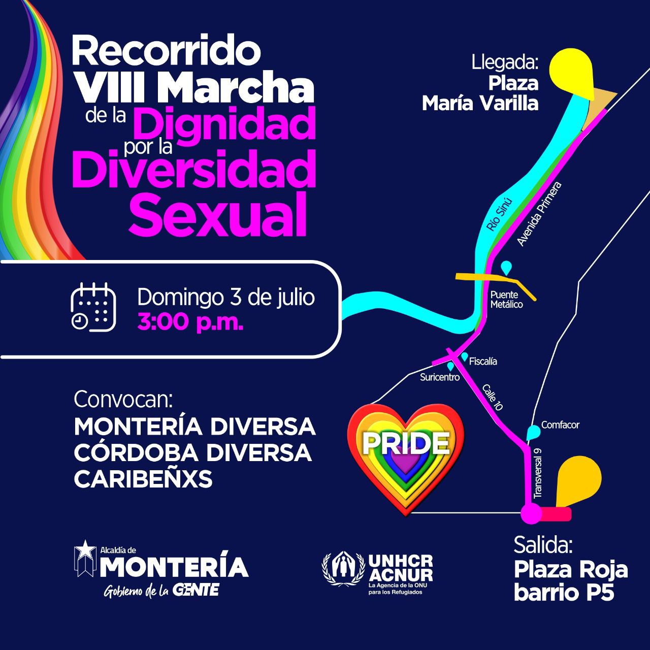Montería, no se queda atrás con esta celebración, es por ello que las organizaciones Córdoba Diversa, Cordoberxia, Montería Diversa y Caribeñxs desde las 3:00 p.m del día domingo 3 de julio, convocan a la marcha VIII marcha de la Dignidad por la Diversidad Sexual que tiene como punto de encuentro la plaza Roja del barrio P5 en el sur de la ciudad.