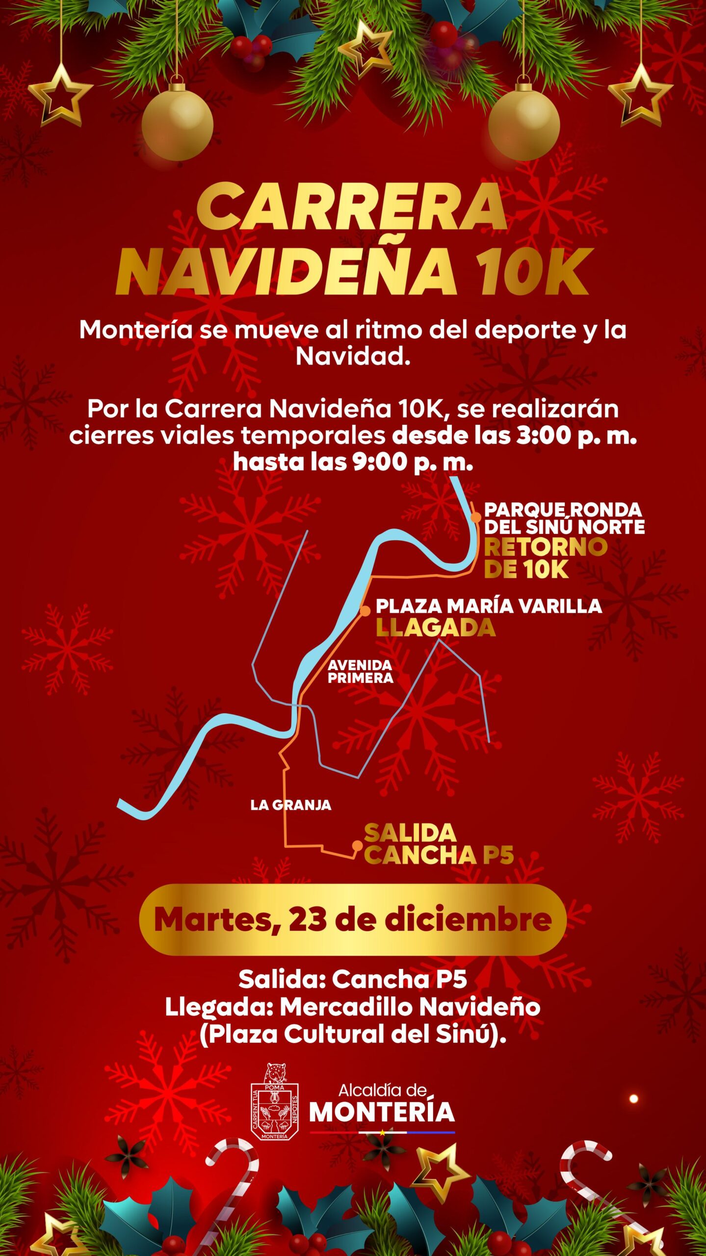 Montería, 22 de diciembre de 2025. Este martes 23 de diciembre se realizará la Carrera Navideña 10K, un evento deportivo y recreativo que hace parte de la agenda decembrina de la ciudad y que busca promover la actividad física, la convivencia ciudadana y el espíritu navideño.