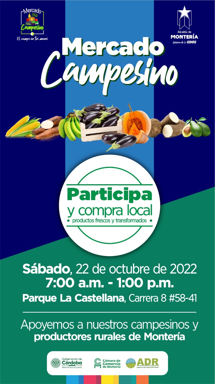 Montería, 21 de octubre de 2022 Con la participación de más de 30 productores y emprendedores del campo, la Alcaldía de Montería mediante la Oficina de Agricultura y Desarrollo Rural, realizará una nueva versión del Mercado Campesino; una gran vitrina que visibiliza lo mejor del campo cordobés.