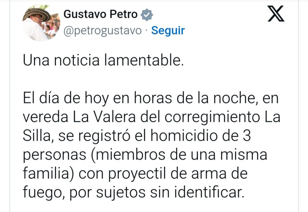 El propio presidente Gustavo Petro se pronunció sobre la masacre en su cuenta de X. “Una noticia lamentable (…). Unidades de Policía se encuentran adelantando actividades de recolección de información y verificación, para establecer los móviles y autores del hecho”, trinó.
