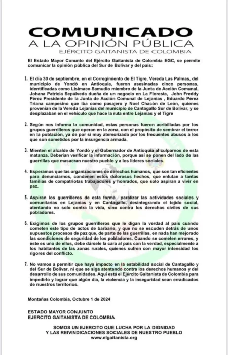 El Ejército Gaitanista de Colombia conocido también como el Clan del Golfo emitió un comunicado en el que desmiente cualquier responsabilidad en la masacre. El comunicado detalla que el ataque fue llevado a cabo por grupos guerrilleros con el fin de sembrar el terror en la comunidad, afectada por los abusos de la insurgencia armada.