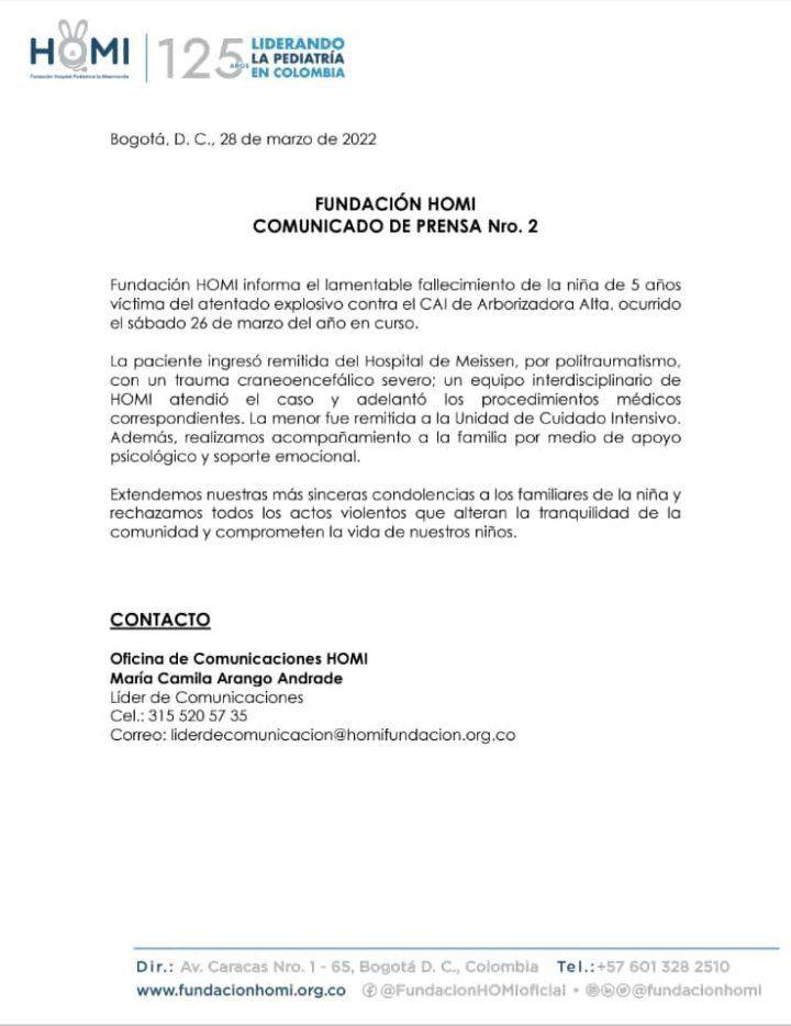 «El equipo interdisciplinario de Homi atendió el caso y adelantó los procedimientos médicos correspondientes», informó la fundacón, señalando que la menor fue remitida a la Unidad de Cuidados Intensivos, UCI.