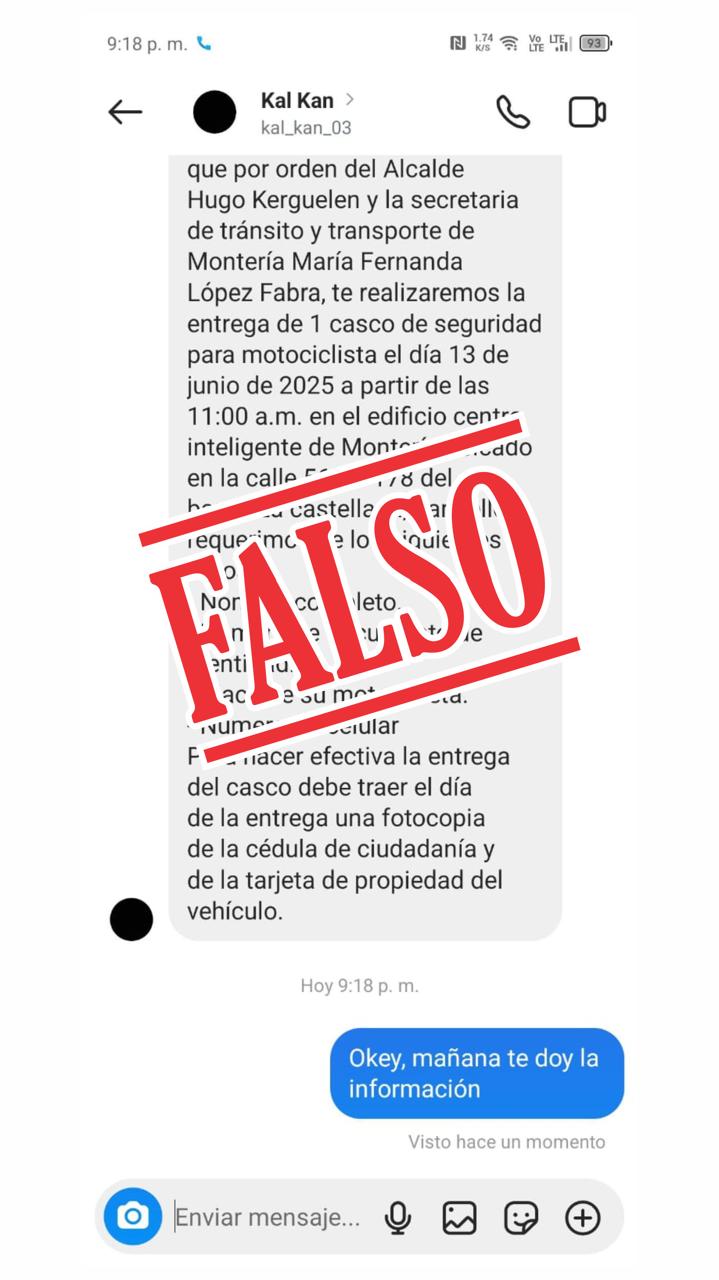 Montería, 13 de julio de 2025. La Alcaldía de Montería informa a la ciudadanía que son falsos unos mensajes que están circulando por una cuenta falsa de Instagram registrada como Kal Kan (kal_kan_03), en el que se menciona al alcalde Hugo Kerguelén García y a la secretaria de Tránsito, María Fernanda López Fabra, para supuestamente convocar a una jornada de entrega de cascos para motociclistas.