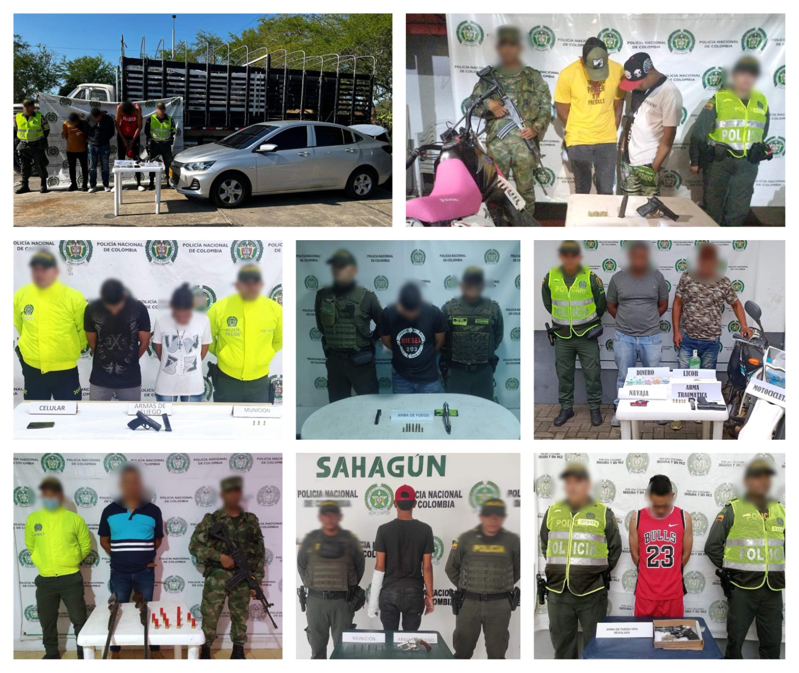 Córdoba. La Policía Nacional a través de unidades adscritas a la Seccional de Investigación Criminal, Inteligencia policial y Modelo Nacional de Vigilancia Comunitaria por Cuadrantes, logró capturar a 14 personas, al sorprenderlas portando de manera ilegal 11 armas de fuego (seis pistolas, dos revólveres, y tres escopetas) con munición para la mismas. Se les incautó además, dos motocicleta de alto cilindraje, un vehículo, cinco celulares de alta gama y dinero en efectivo.