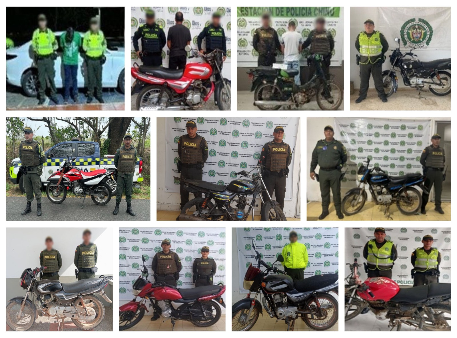 Durante la semana, uniformados adscritos a la Seccional de Investigación Criminal, Inteligencia Policial, Tránsito y Transportes, y Modelo Nacional de Vigilancia Comunitaria por Cuadrantes, han logrado la recuperación de 10 motocicletas y un vehículo, avaluados en aproximadamente $’160.000.000; se adelanta el trámite administrativo ante la Fiscalía General de la Nación para devolverlos a sus legítimos propietarios.