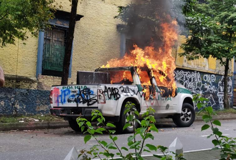 Asu paso por el barrio Manrique de Medellín, un grupo de personas prendió fuego a una patrulla de la Policía que hacía parte del dispositivo de seguridad en medio de las manifestaciones, en la conmemoración del Día del Trabajo y en contra de la reforma tributaria.